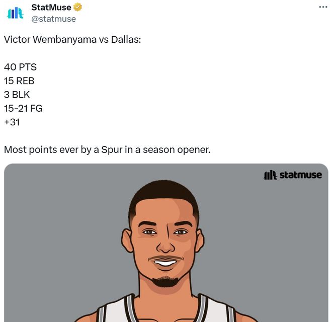 由于比赛早早一边倒,面对提前放弃的独行侠队,文班全场仅出战29分40秒,但凭借21投15中的夸张效率,爆砍40分15篮板1助攻1抢断3盖帽炸裂数据。