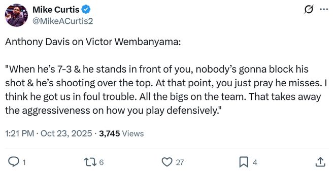 这并非是夸大文班的表现与贬低浓眉哥的防守,而是双方在场上实打实对位过程中碾压式差距的直观展现。