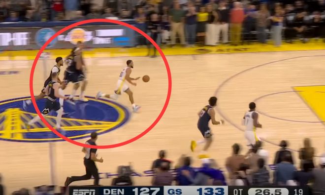 库里一溜烟加速从约基奇身边跑过,而约老师在中场竟然在慢慢的散步溜达着走,一点都没有紧迫感和要上去防守的意思,就看着库里从身边过去了。戈登都无奈了,戈登当时没放弃,掘金队友也没放弃,他还跑到约老师身边推了他背一下,想赶紧让他上去防守,但是约基奇也不上去,就看着库里在这跑。