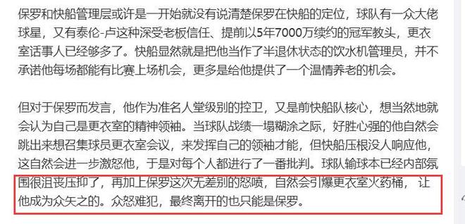 当然,快船管理层的做法肯定是太过激进了,但也不得不说,保罗怒喷全队上下的做法,实在不明智,这也和保罗的火爆的脾气性格,以及在快船更衣室的地位没拎清楚有关。
