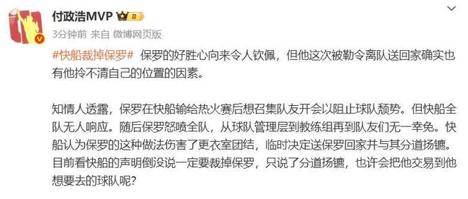 快船近期战绩低迷,而又在客场备战期间做出如此疯狂操作,实在让人看不懂,引发了大量球迷的不解和愤怒,那么说,快船如此突然的送走保罗,到底是什么原因?这其中到底有什么隐情?不妨来看看媒体人付政浩给出的个人见解,在保罗离队后付政浩在个人社媒上发布了一篇长文,开头就解释了保罗离队的真相: